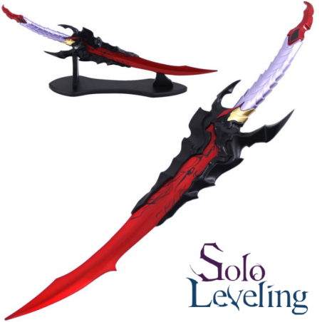 This 60cm dagger, inspired by Kamish's Wrath from the Solo Leveling universe, replicates the dark and organic appearance of the weapon used by Sung Jin-Woo. The blade features a pronounced curve with a gradient red finish, traversed by black vein-like patterns. The guard adopts a demonic shape in matte black with lateral spikes, complemented by gold details near the blade junction. The upper part of the blade has a sculpted section in a translucent purple hue, enhancing its fantastical style. The entire piece is crafted with a stainless steel blade and comes with a black display stand for horizontal presentation.