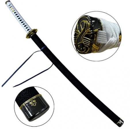 Cette réplique du katana Yamato V2, inspirée de l’univers Devil May Cry, rend hommage à l’arme emblématique de Vergil. Elle se compose d’une lame en acier inoxydable non tranchante d’environ 70 cm, montée sur un tsuka (poignée) enveloppé de cordage blanc dans le style traditionnel japonais. Le fourreau est en bois recouvert de daim en relief noir, une lanière bleue permet de le porter ou de l’accrocher facilement, rehaussé d’éléments décoratifs métalliques dorés, assortis à la garde octogonale finement ornée. Longueur totale 104 cm. Un objet pensé pour l’exposition, idéal pour les amateurs de pièces fidèles à l’univers vidéoludique.