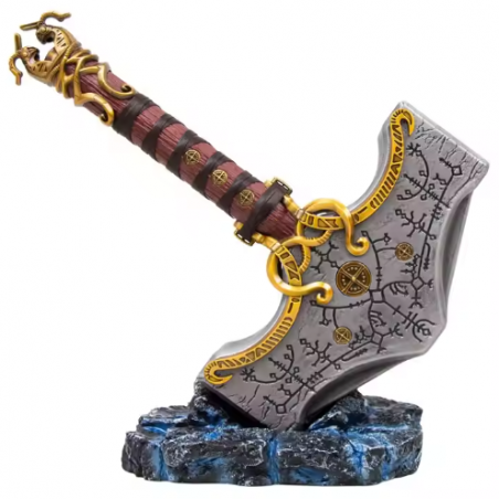 Cette reproduction met en valeur les détails de conception visibles dans le jeu : une tête massive gravée de runes, un manche orné de dorures complexes et une base décorative en résine représentant un socle rocheux bleuté. Elle est aussi dotée d’un revêtement lumineux discret qui se charge à la lumière pour briller faiblement dans l’obscurité, rappelant l’éclat du pouvoir de Thor lorsqu’il invoque la foudre.